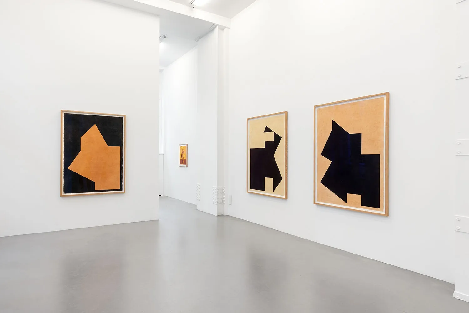 • In Études pour une forme quelconque (d’après Sebastiano Serlio) (2020) and Suites serliennes (2022), marquetry has given way to charcoal, not in celebration of the perspectivist thinking of cinquecento architect Sebastiano Serlio; rather, to honour the simplicity of some of Serlio’s forms, devoid of all mathematical complexity, through a series of large abstract drawings on ochre[1] backgrounds depicting fragments of diagrams taken from his book On Geometry, On Perspective (1545). Perspective is forgotten once and for all, and time stops in the mural? (2022) painted by the duo Hippolyte Hentgen[2], invited by Zarka to participate in his exhibition. The work features decorative motifs taken from the Scottish sundial, fragmented using simplified line on a moiré-patterned background that plays of the velvety aspect of the charcoal in the Suite serlienne.